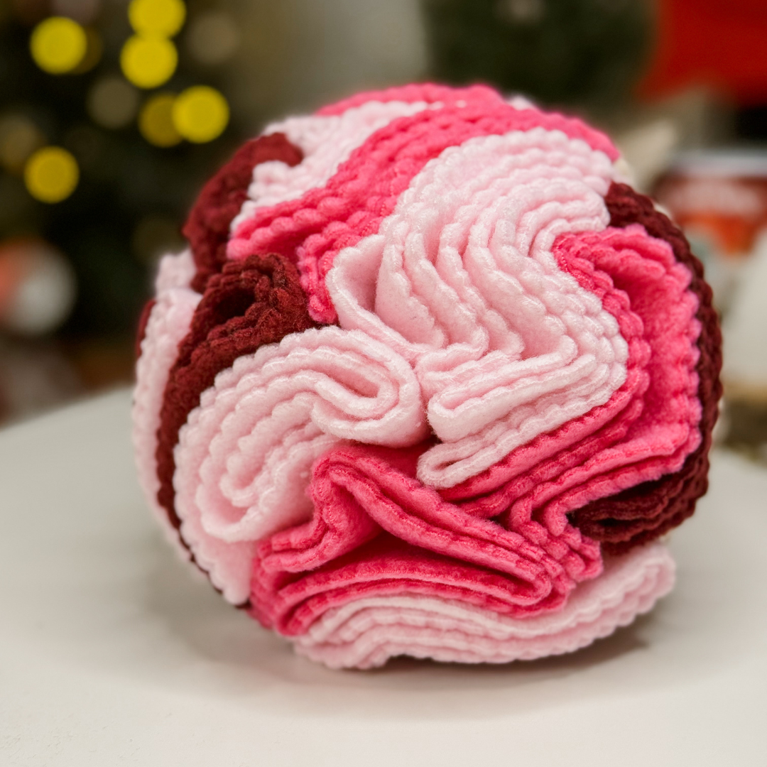Słodka jak deser, a zdrowa jak spacer w lesie. Kula węchowa dla psa MALINOWE CIASTECZKO to ręcznie wykonana zabawka, która zamienia zwykłe podawanie smaczków w angażującą zabawę dla psiego nosa. Dzięki licznym zakamarkom pies musi węszyć, kombinować i skupić się, co naturalnie go wycisza i zaspokaja potrzebę pracy umysłowej. Idealna na nudę, gorszą pogodę albo jako codzienny rytuał relaksu. 🍪🍓
